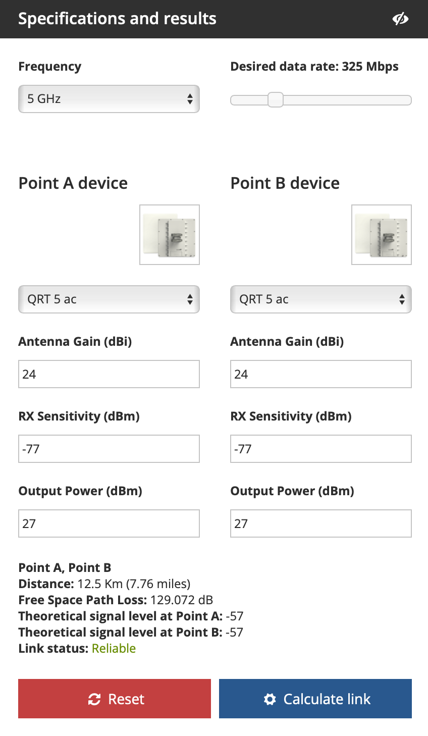 With the details obtained from the site survey and line of sight assessments, you can utilize the MikroTik Wireless Link Calculator to estimate the performance and feasibility of a Point-to-Point (PTP) wireless link.
